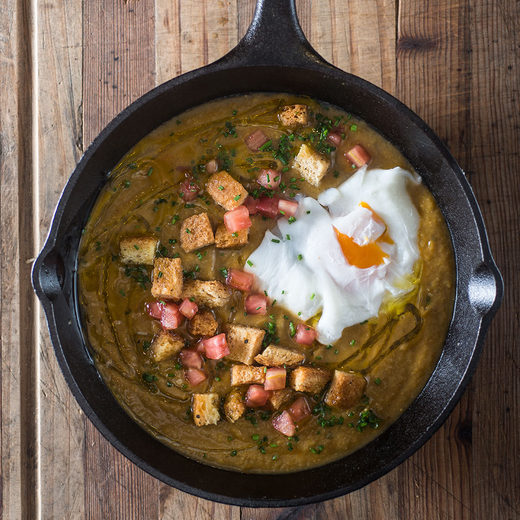 Colocar la preparación anterior en el procesador de alimentos hasta formar una crema. Colarla bien. Servir la crema de minestrone bien caliente y colocar encima el huevo escalfado o poché, el tomate cortado en concassé, la albahaca picada, los croutones y aceite de oliva al gusto.